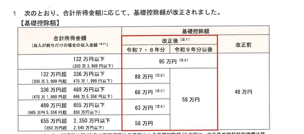 | 基礎控除 | 本人の合計所得金額に応じて段階的に適用 | 58万~95万円(令和7・8年分は特例加算あり) | 最大95万円 |