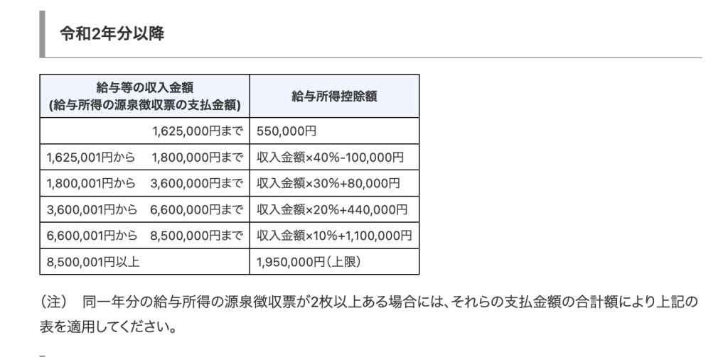 この給与所得控除は、国税庁の「給与所得控除の速算表」または、「所得税法別表第五(年末調整等のための給与所得控除後の給与等の金額の表)(e-Govへリンク)」に基づいて計算します。
