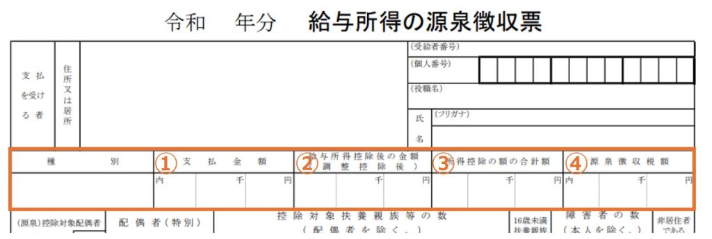 以下のように源泉徴収票の各欄をそのまま転記します。