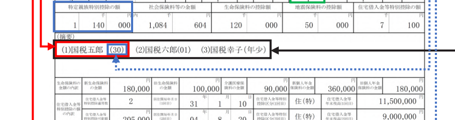 ③ 扶養親族が特別障害者または23歳未満の場合扶養親族の氏名の後に「(調整)」を記載所得金額調整控除対象例:「国税 一郎(調整)」